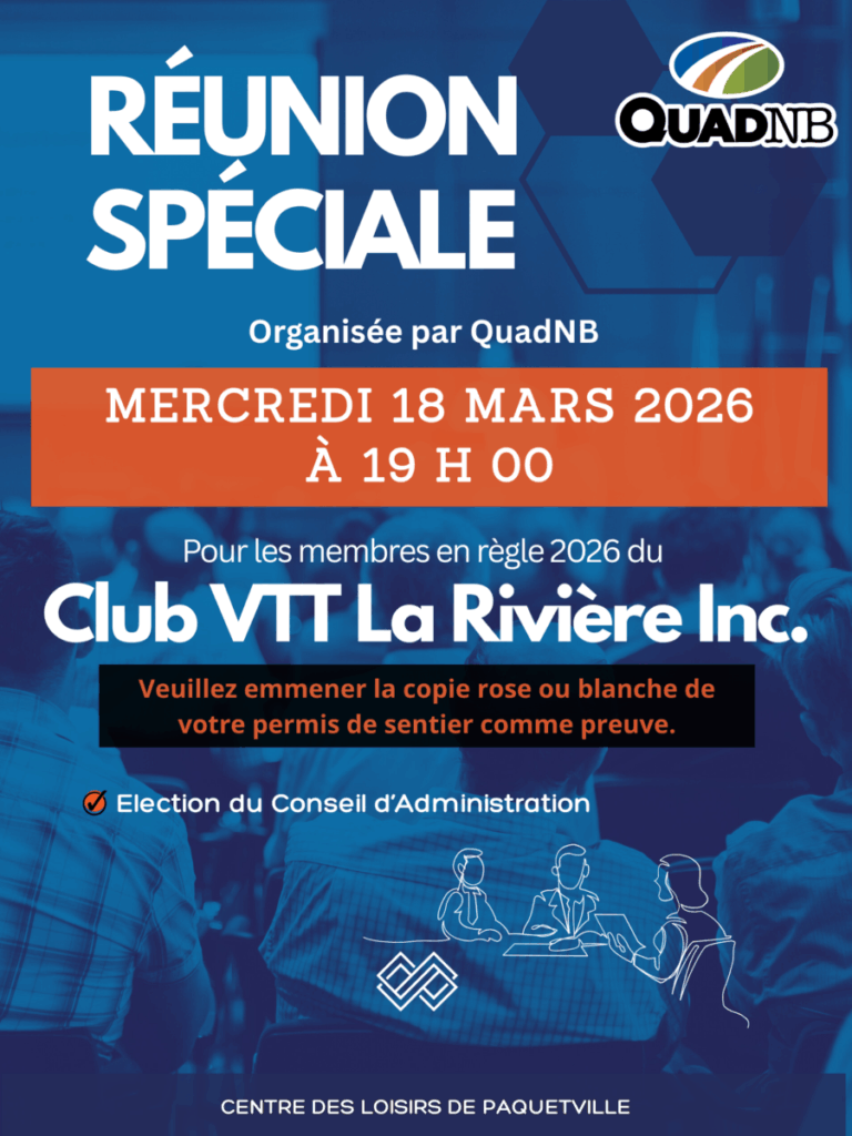 La Ville de Haut-Madawaska a reçu une demande de QuadNB (Fédération des véhicules tout-terrain du Nouveau-Brunswick) pour avoir accès à des rues de la municipalité. Pour permettre aux citoyens et aux adeptes du quad d'en apprendre davantage sur cette demande, une consultation publique aura lieu le 19 mars, de 19 h 00 à 21 h, dans l’amphithéâtre du Complexe multifonctionnel de Clair, au 325 boulevard Long, à Clair, N.-B.