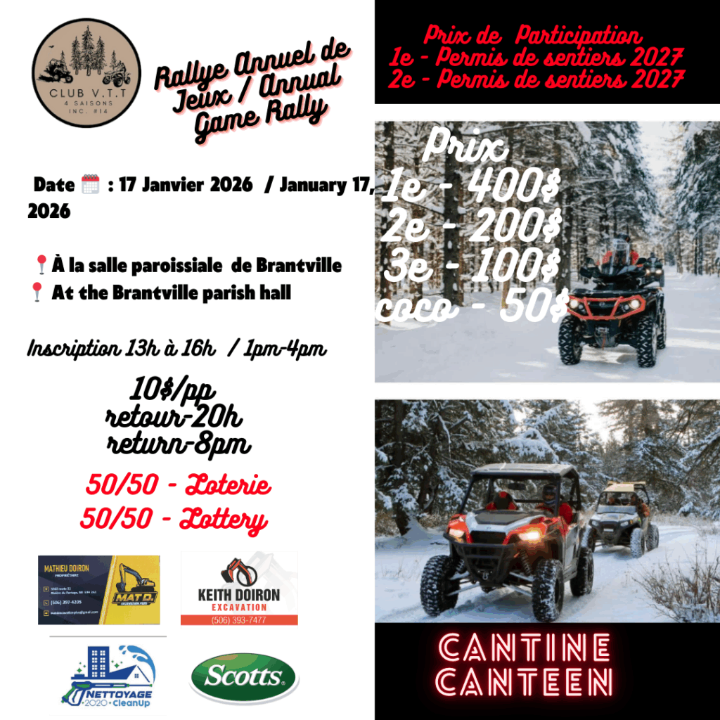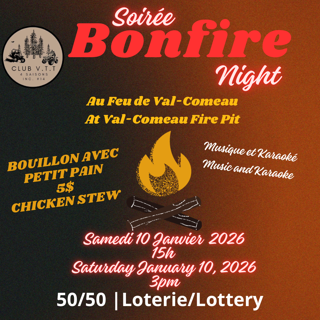 We are Club VTT 4 Saisons #14, and we invite you to gather at the Val-Comeau, NB, bonfire on trail 1402. An evening of music and karaoke outdoors.