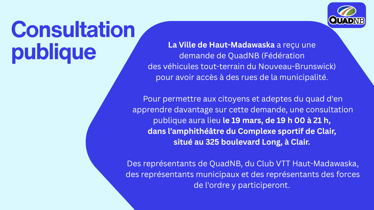 QuadNB extends a special invitation to members in good standing of the La Rivière ATV Club to participate in the club's relaunch. An emergency meeting will be held at the Centre des Loisirs in Paquetville, on February 26, at 7:00 p.m. The address is 1086 rue du Parc, Paquetville. We are looking for people with […]